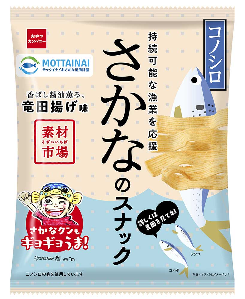 「ベビースターラーメン」で知られる「おやつカンパニー」は27日、低流通魚をスナック菓子の原料に使う「モッタイナイおさかな活用計画」をスタートさせると発表しました。第1弾はすしネタでおなじみのコハダの成魚・コノシロを使った商品「素材市場さかなのスナック(香ばし醬油薫る、竜田揚げ味)」です。同日から全国のコンビニやスーパーなどで発売を開始しました。
