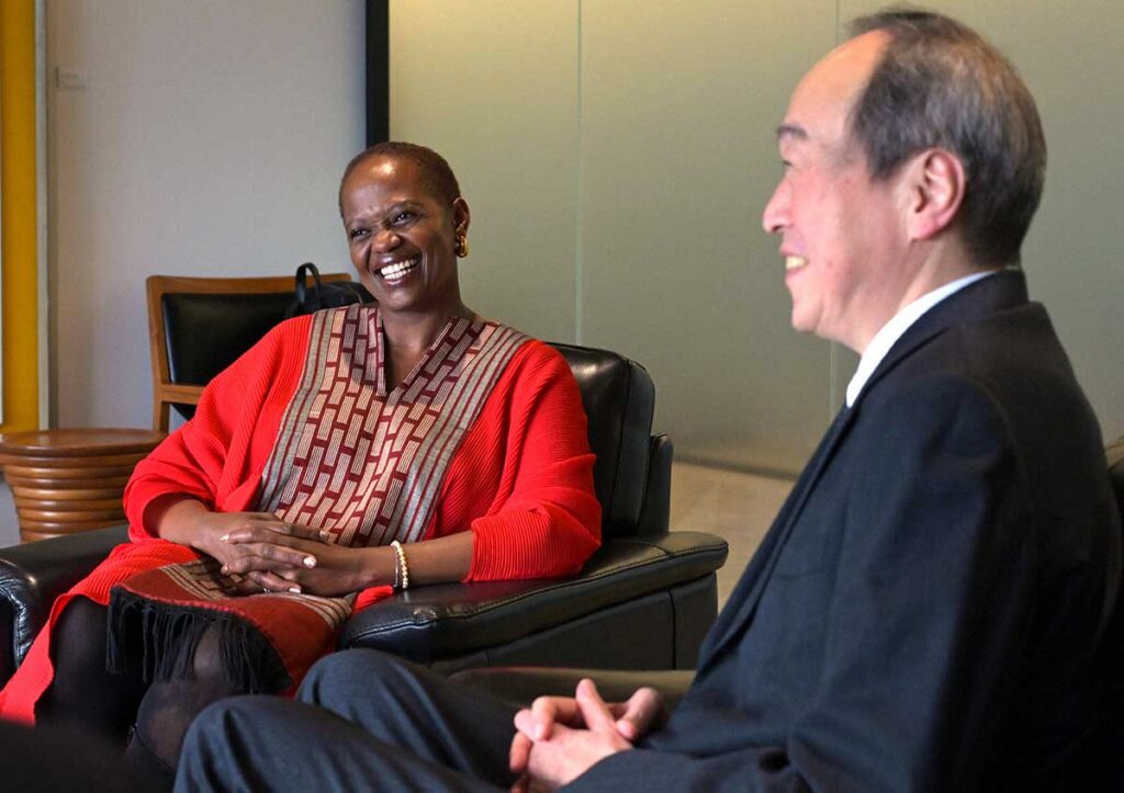 シンポジウムに先立ち、ワンジラ・マータイさんが毎日新聞東京本社を訪問し、松木健社長と会談しました。松木社長はこれまでの尽力に感謝した上で「地球環境の保護に向けて今後も協力をお願いしたい」と要請。ワンジラさんは「これまでも毎日新聞社との活動に私自身も刺激を受けてきた。これからも協力していきたい」と応じました。 深刻化する気候変動問題について、ワンジラさんが「人々は危機感を持ちながら、行動が起こされていない」との認識を示すと、松木社長は「MOTTAINAIという言葉は行動に移すためのシンボルになる。この言葉を世界中に広げて、共通語にしていきたい」と応じました。