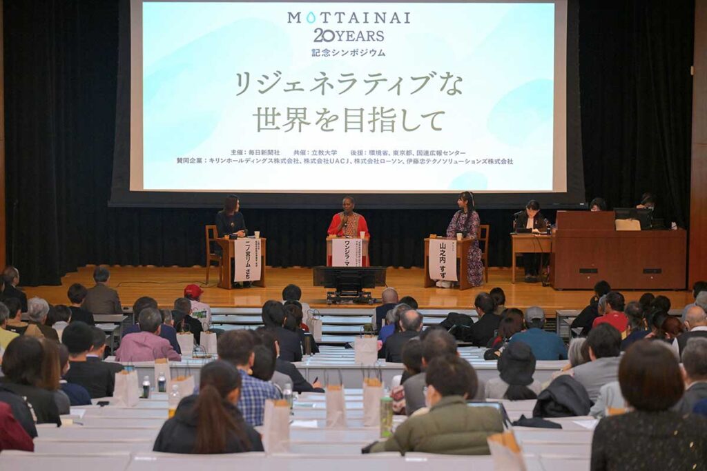 MOTTAINAIキャンペーンの活動20周年を記念したシンポジウムが12月22日、東京都豊島区の立教大学池袋キャンパスで開かれました。キャンペーンを提唱したワンガリ・マータイさんの長女で世界資源研究所マネジングディレクターのワンジラ・マータイさんや、キャンペーンに賛同する企業の担当役員らが参加。約250人が会場で聴講し、オンラインでも配信されました。