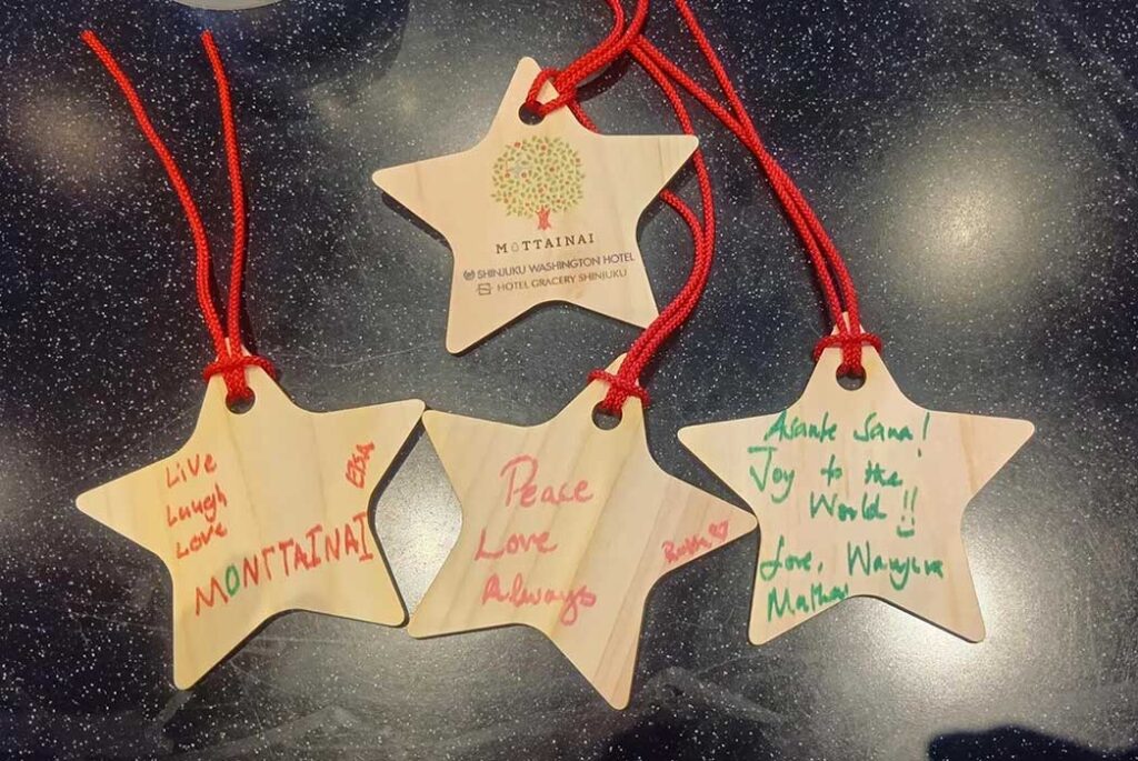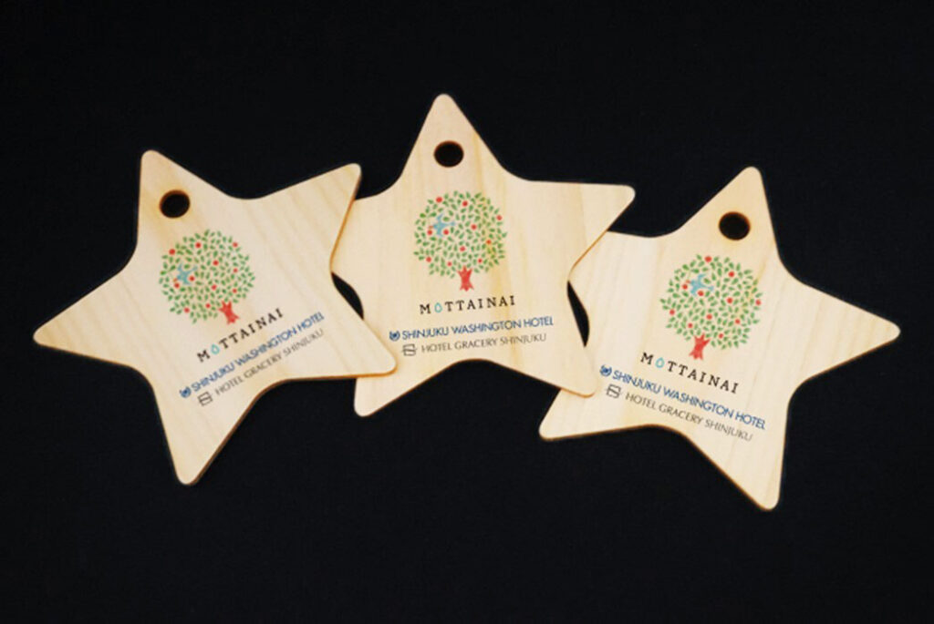 WHG新宿によるチャリティーオーナメントのイベントは今回が初めての取り組みです。環境に配慮した国産ヒノキの間伐材を使用し、MOTTAINAIキャンペーンのイラストとロゴを組み合わせ、自然の温もりを感じられるデザインに仕上がっています。思い思いにメッセージを書き込むことができ、ロビーに設置したクリスマスツリーに飾ったり、持ち帰って自宅のツリーやお部屋のインテリアとして楽しんだりすることができます。